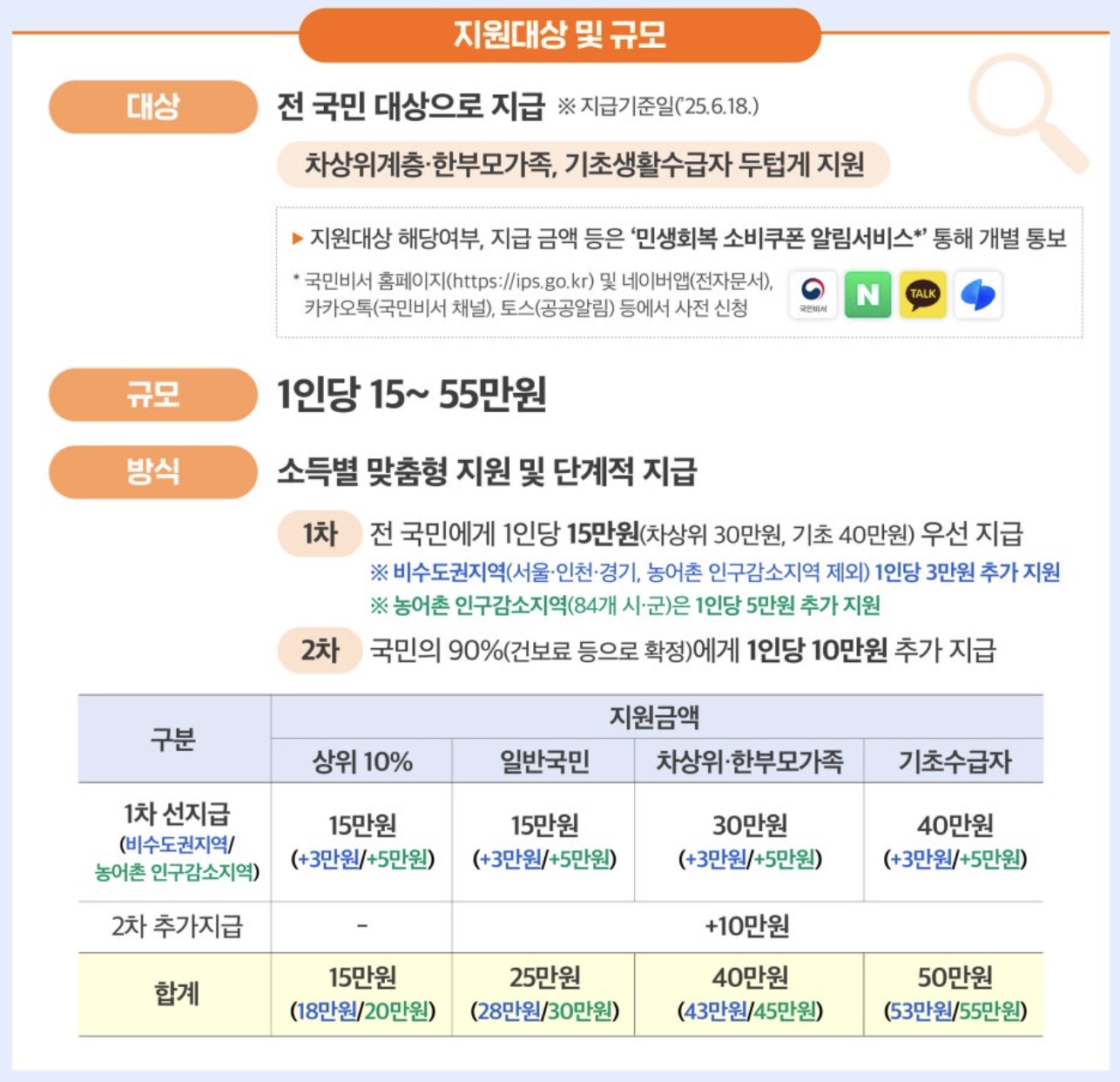지급액은 소득 수준에 따라 1인당 15만원에서 최대 55만원까지 차등 지급됩니다. 단계별로 지급이 진행되니 아래 표를 꼼꼼히 확인해주세요. 대부분의 국민들은 25만원 이상 받게 될겁니다. (2차 신청분 포함입니다.)