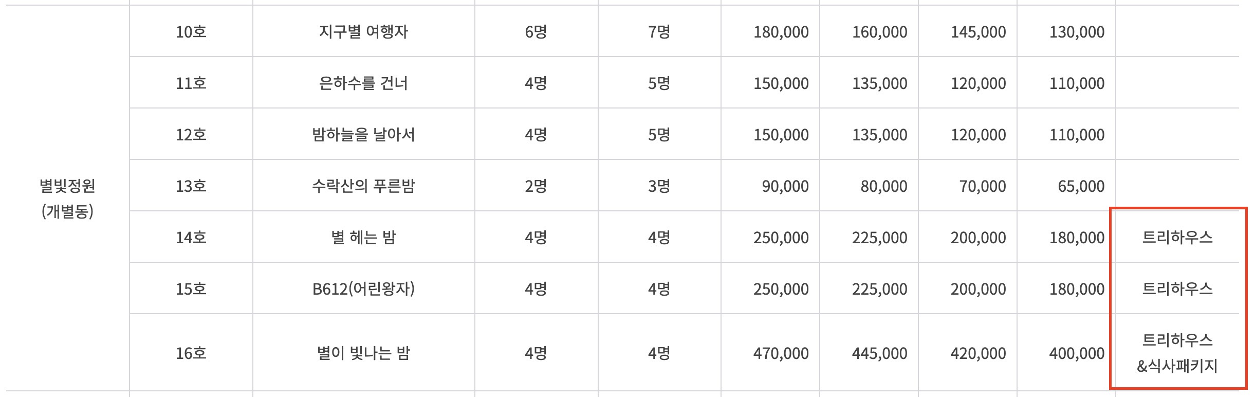 | 트리하우스 4인실 (10평형) | 4인/4인 | 200,000원 | 250,000원 |