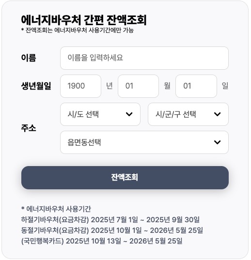 ※ 중요 고지: 본 정보는 2025년 에너지 바우처 공식 홈페이지(www.energyv.or.kr) 정보를 기반으로 작성되었으며, 정책 및 상세 내용은 변경될 수 있습니다. 최신 정보와 정확한 신청 자격 및 지원 금액은 반드시 공식 홈페이지 또는 거주지 읍면동 행정복지센터(주민센터)를 통해 확인하시기 바랍니다.