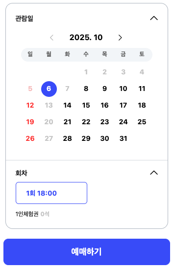 - ④ 날짜/시간/매수 선택: 원하는 날짜와 시간을 선택하고, 필요한 티켓 매수를 선택합니다. 1인당 예매 가능 매수가 제한될 수 있습니다 (예: 2~4매).