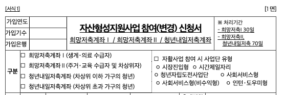 - 자산형성지원사업 참여 신청서 (읍면동 주민센터 구비 또는 자산형성포털 다운로드)