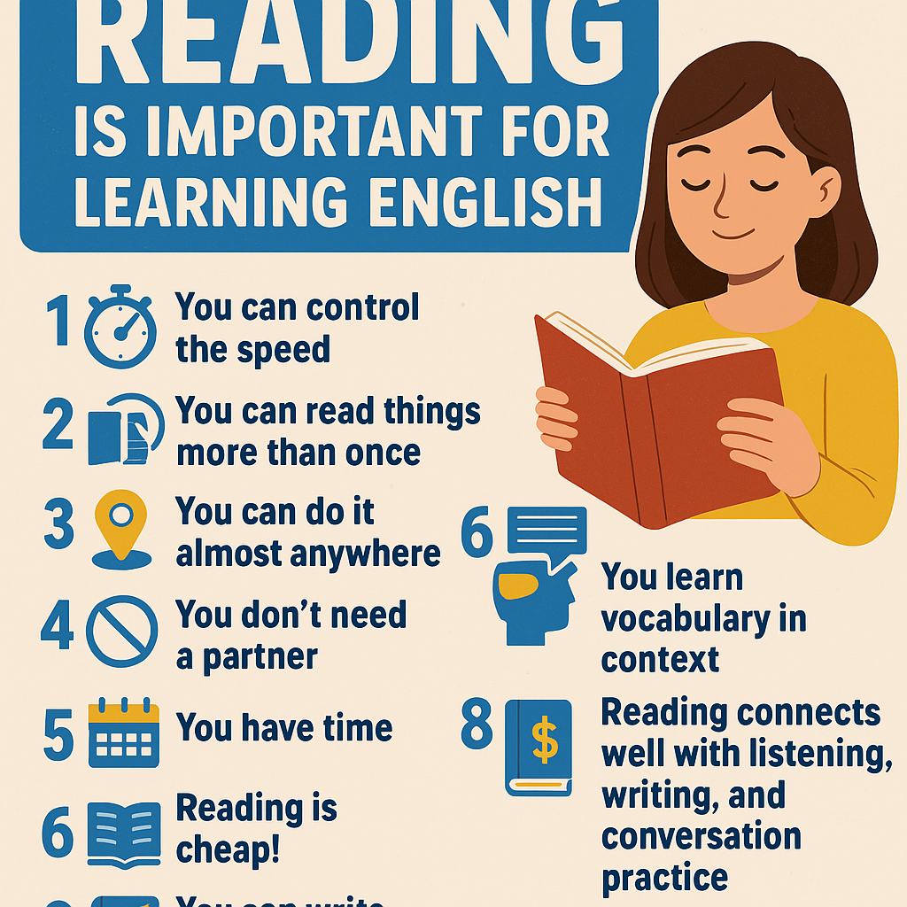 ✅ 8. Reading connects well with listening, writing, and conversation practice.