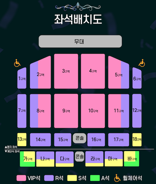 - 시야 제한 좌석: 일부 좌석은 무대 연출 상황 및 아티스트 위치, 콘솔, 구조물, 장치, 카메라 등으로 인해 시야 제한이 발생할 수 있습니다.