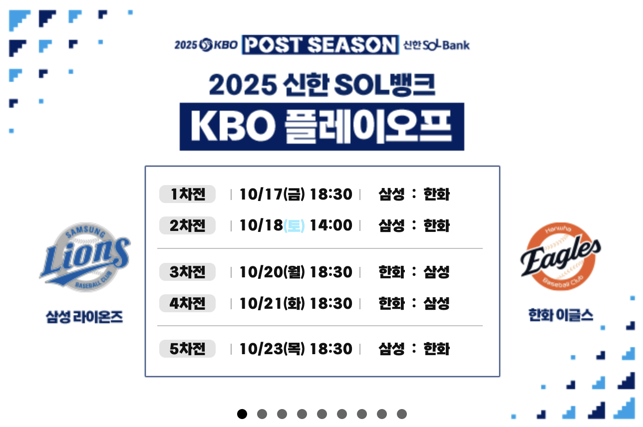 - 5차전(예정): 10월 23일(목) 오후 6시 30분 – 대전 한화생명 이글스파크