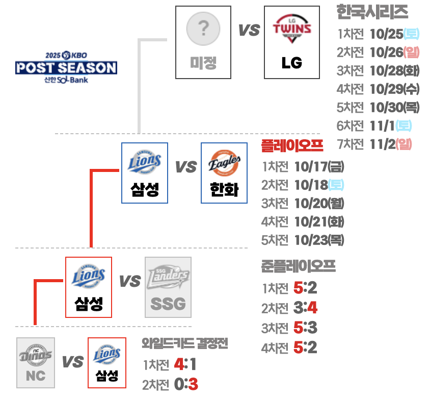 플레이오프에서 최종 승리하는 팀은 정규시즌 우승팀 LG 트윈스와 2025 한국시리즈에서 만나게 됩니다. 한국시리즈는 4선승제로 진행되며, 잠실 야구장을 중심으로 아래 일정이 예정되어 있습니다.